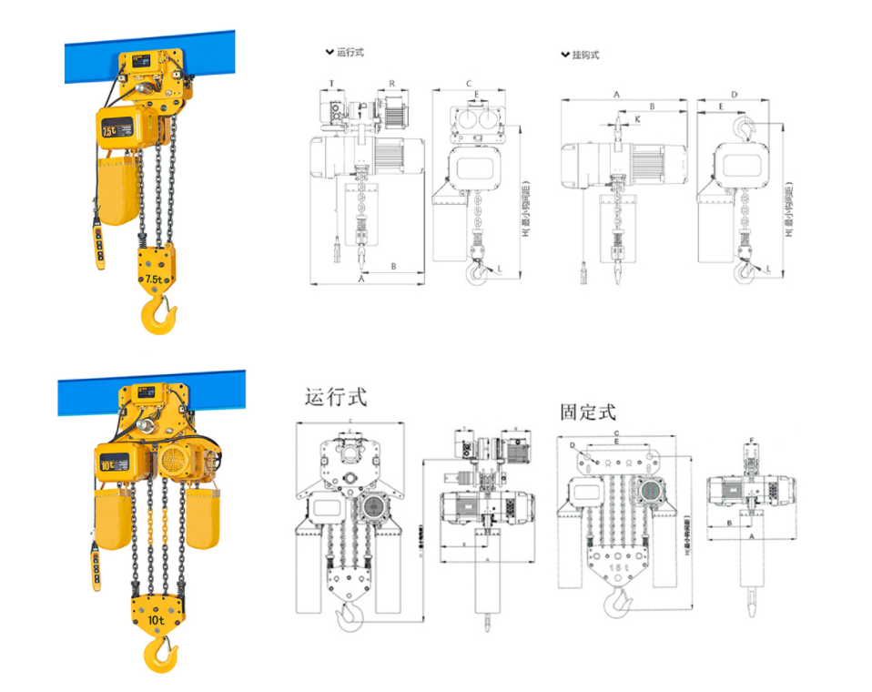 | 運(yùn)行式環(huán)鏈電動(dòng)葫蘆(7.5T-50T)尺寸參數(shù): | ||||||||